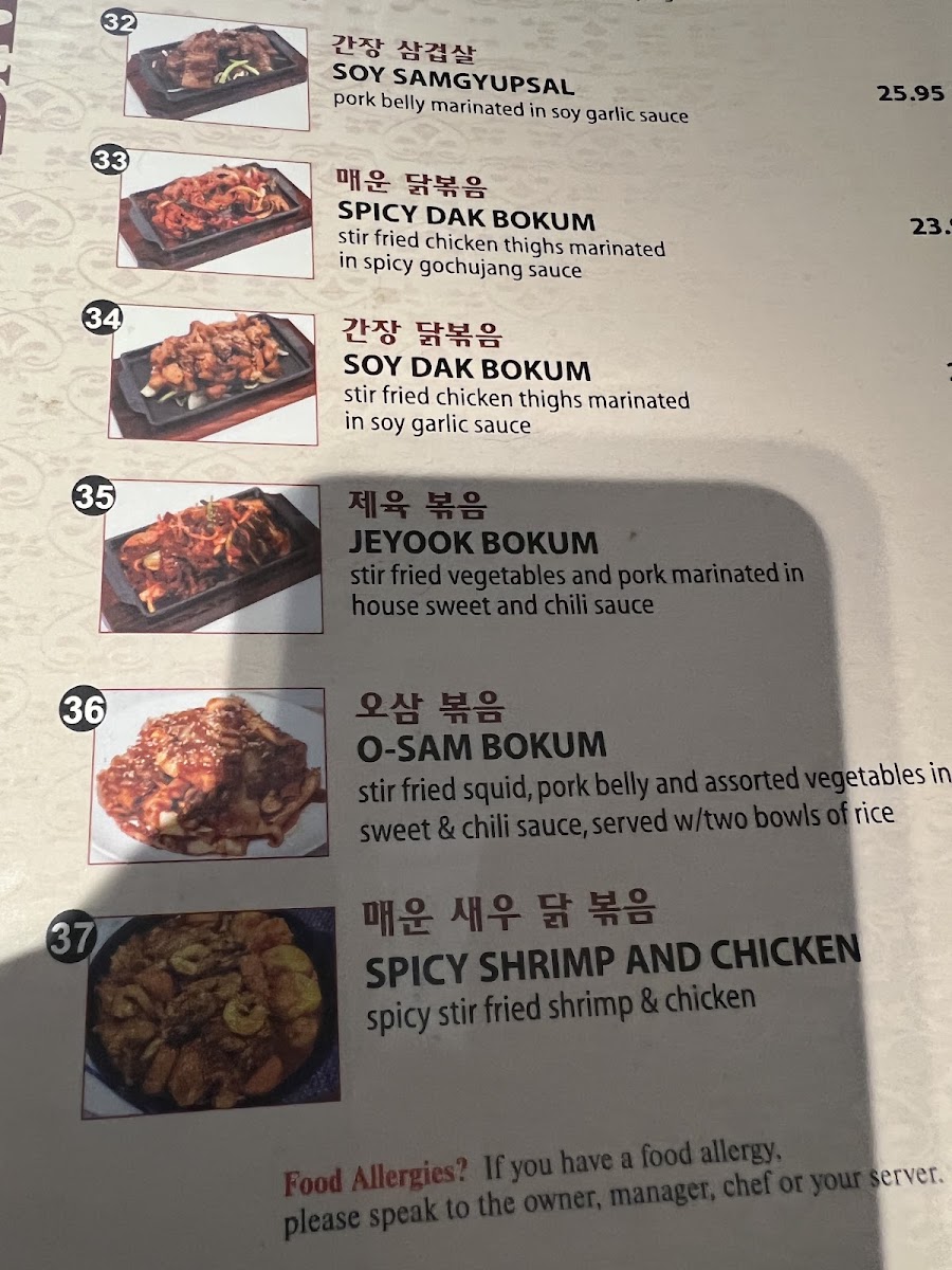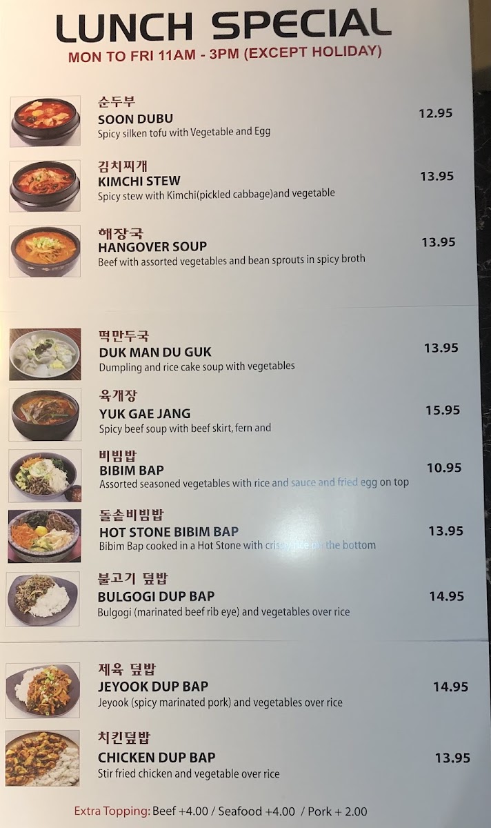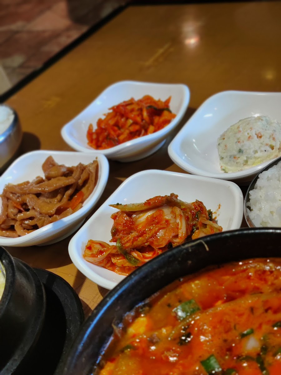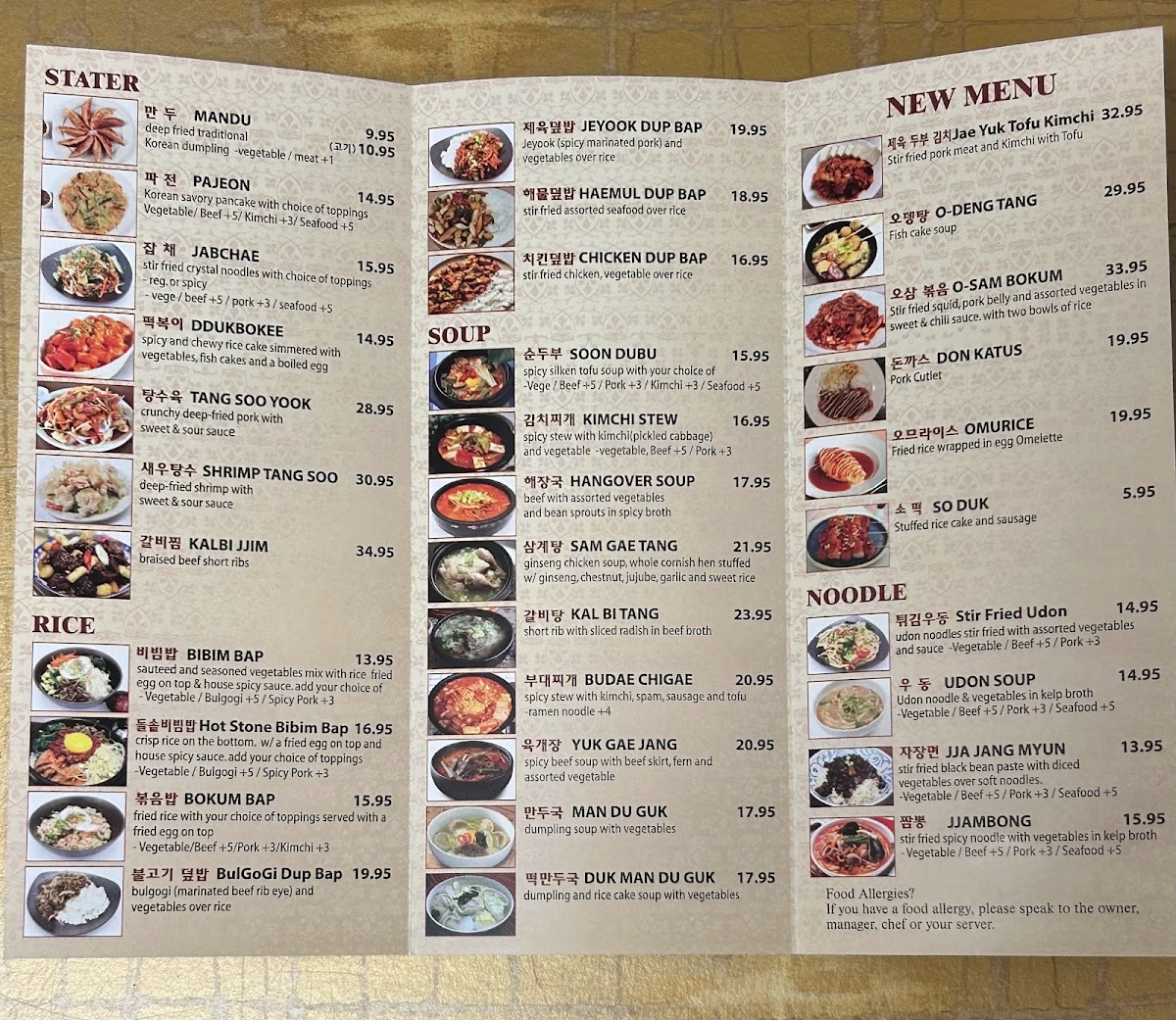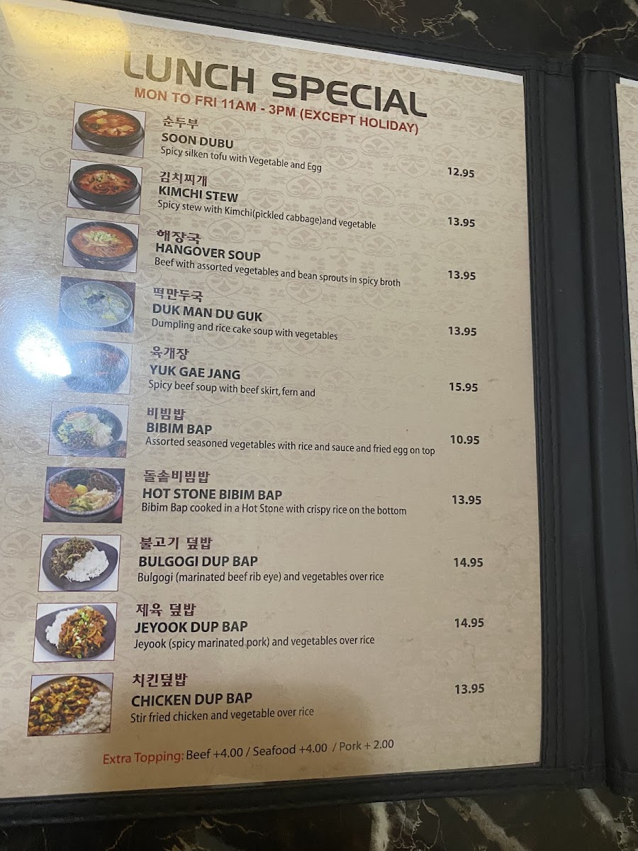 The menu is a delightful exploration of flavors, offering something for everyone. Start your meal with a classic Soon Dubu (Soft Tofu Soup), a delicately spicy and warming dish that features silky tofu nestled in a broth that’s as flavorful as it is comforting. Or, if you're in the mood for something hearty, you can't go wrong with the Kimchi Stew, a fest of spicy, pickled cabbage packed with vibrant vegetables. Need a kick for your taste buds? The legendary Hangover Soup boasts a rich broth with tender beef, assorted vegetables, and bean sprouts, a must-try that exemplifies solace after a long night.